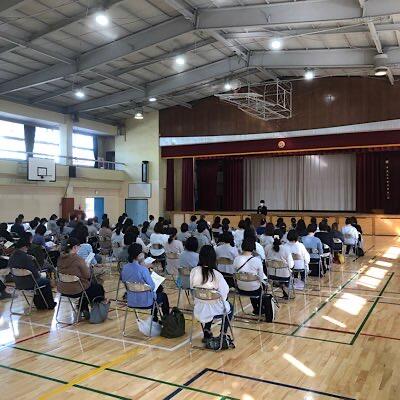 生徒の受付は正門から入り、正面の校舎前で行います。