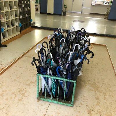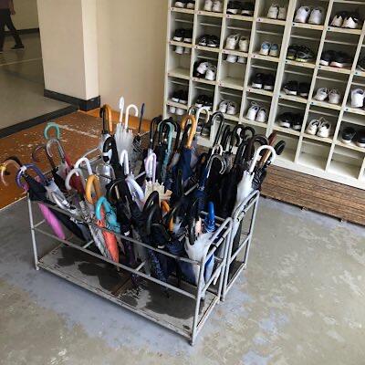 大勢で使う傘立ては、傘をまとめて止めてから、帰りに取りやすいように揃えて入れるとみんなが助かります