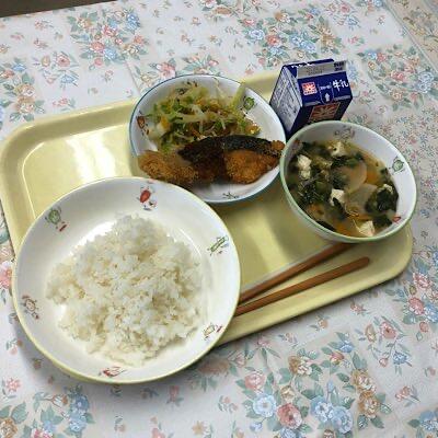 鮭フライ 辛子和え 具だくさんのみそ汁 ごはん 牛乳