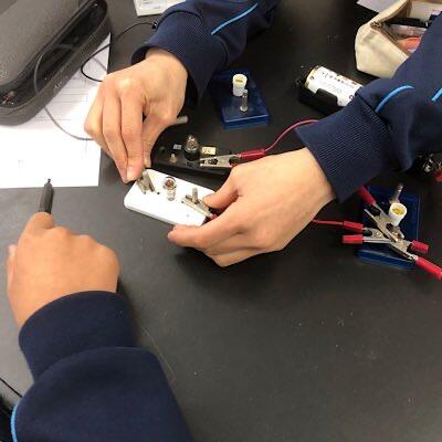 電流回路を作り、直列と並列の違いを調べています