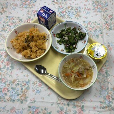 チキンピラフ ミートボールスープ たこきゅうり ソフール(レモン) 牛乳