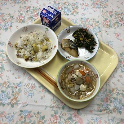 さつまいもごはん さばの文化干し 豚汁 おかか辛子和え 牛乳