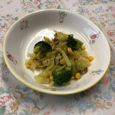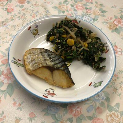 辛子和えは、しっとりのほうれん草、シャキシャキのもやし、プチプチのコーンが三重奏する中、おかかの存在感が光る一品