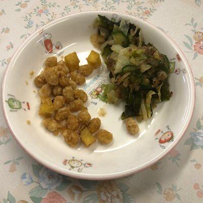 揚げた大豆とサイコロカットのサツマイモにきな粉をまぶした和風スイーツです