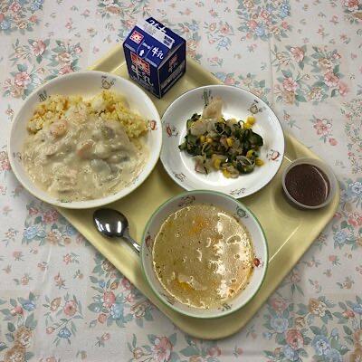 ドリア風カレーピラフ オニオンスープ かぶのサラダ ココアゼリー 牛乳