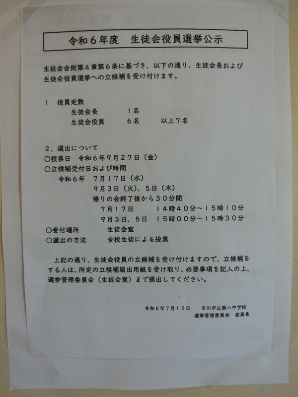 校内に、生徒会役員選挙の選挙公示が掲示されいました。