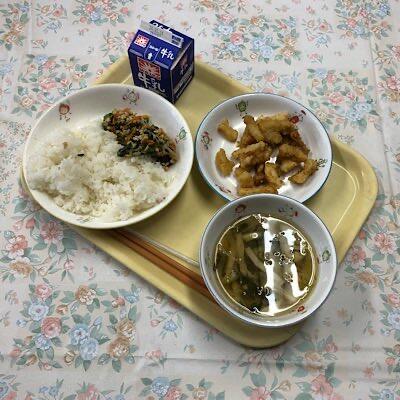 イカのかりん揚げ すまし汁 納豆和え ごはん 牛乳