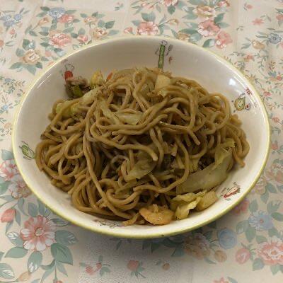 焼きそば 中華風コーンスープ ごぼうサラダ マンゴープリン、牛乳