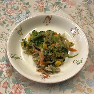 ごぼうの力強さをベースに、プチプチコーンの甘味、シャキシャキのキャベツ、レタス、にんじん、