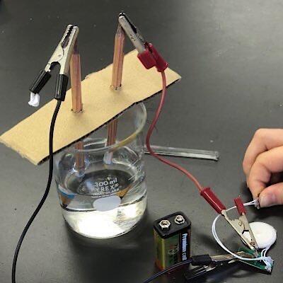 えんぴつ電池からオルゴールに電流を流すとハッピーバースデーのメロディが聞こえます