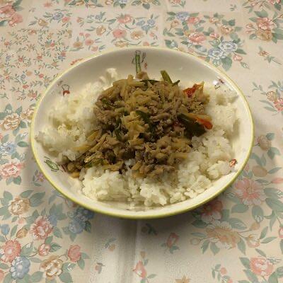 香ばしく濃いめのぶた肉とピーマン、たけのこが白米とベストマッチ