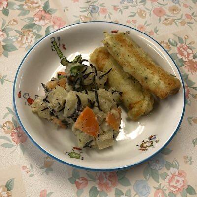 ちらし寿司 竹輪の磯辺揚げ すまし汁 ひじポテサラダ ひなあられ 牛乳