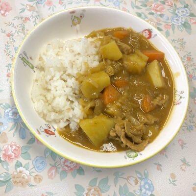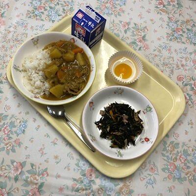 ポークカレーライス ひじきのマリネ おかしな生たまご 牛乳