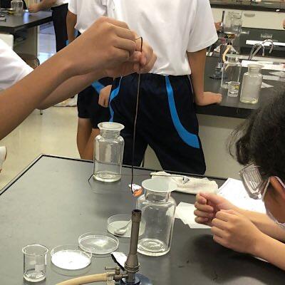 砂糖、食塩、片栗粉を燃焼させ、変化を比べています