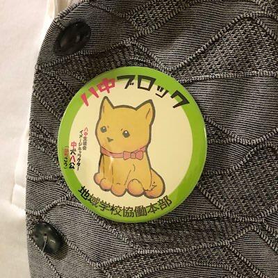 バッジデザインに、八中生徒会マスコットキャラクターの中犬八公が使われています