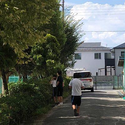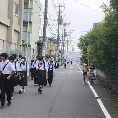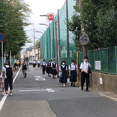 八中前のあいさつロードは、中学生は、八中側を小学生は、鶴指小側を歩きます