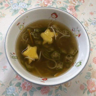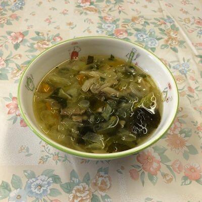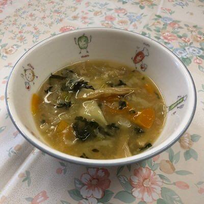ベーコンと緑黄色野菜がたっぷり、豪華な具材のスープです
