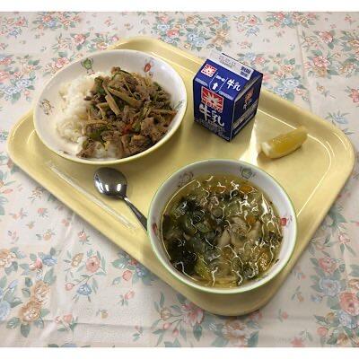 ごはん チンジャオロース わかめスープ 小夏 牛乳