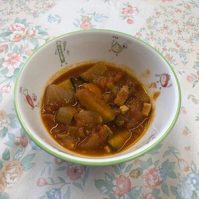 洋風煮物は、トマトベースのスープで鶏肉、ベーコン、ズッキーニ、タマネギ、ニンジンなどを煮込みました