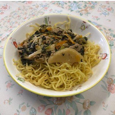 小松菜とぶた肉の焼そば 卵スープ フルーツ白玉 牛乳