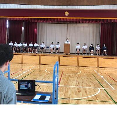 体育館と教室をオンラインでつなぐハイブリッド方式で実施中です