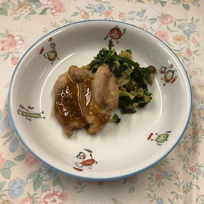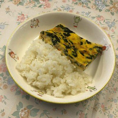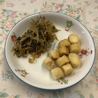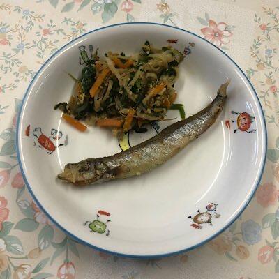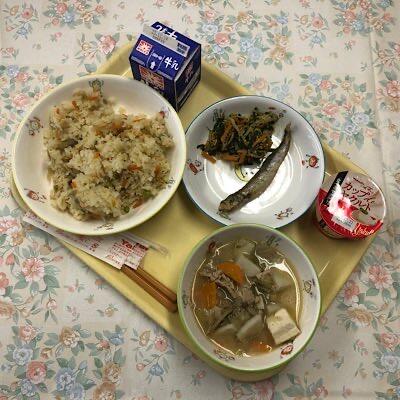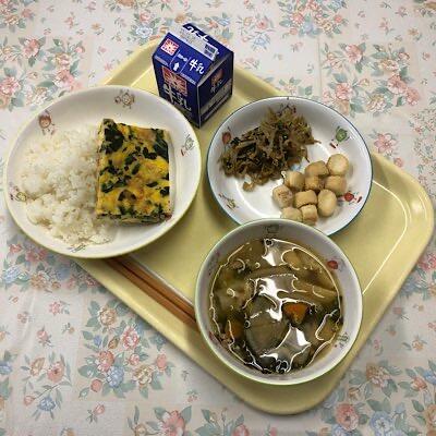 千草焼き のっぺい汁 おかか和え ごはん お麩のバターシュガー 牛乳