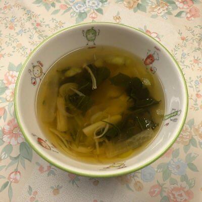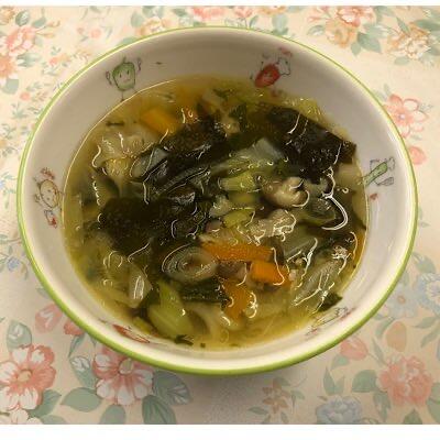 わかめスープの実体は、具材たっぷり(ベーコン、にんじん、ネギ、チンゲン菜、しめじ、キャベツ)の食べ応えアリのスープです