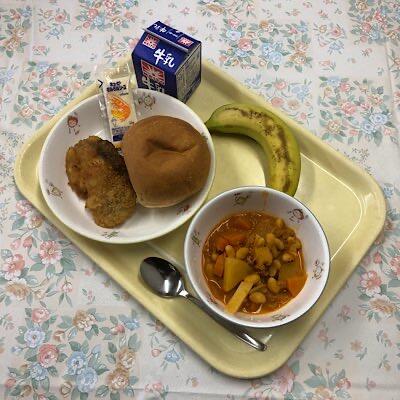 ドライカレー カリカリベーコンサラダ フルーツヨーグルト 牛乳