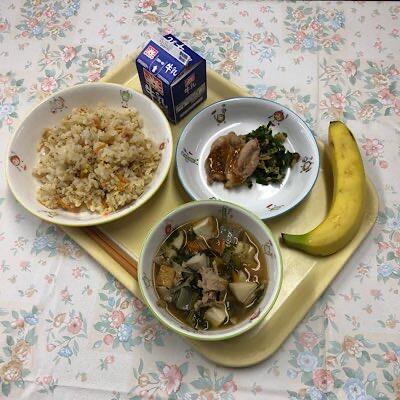 大根菜飯 鶏肉のごまだれかけ けんちん汁 柚香和え バナナ 牛乳
