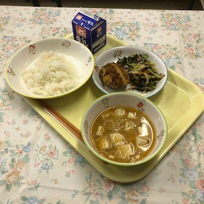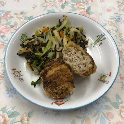 キャベツメンチ みそ汁 ごま酢和え ごはん 牛乳