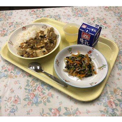 麻婆豆腐丼 ナムル りんごゼリー 牛乳
