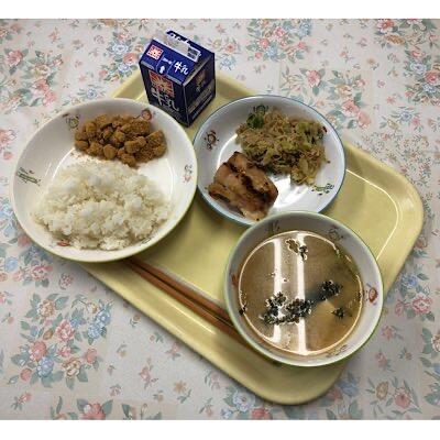 ご飯 ぶりの竜田揚 納豆和え けんちん汁 麩のシナモンシュガー 牛乳