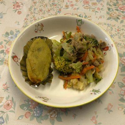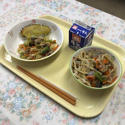 具だくさんうどん 焼肉サラダ スイートポテト 牛乳