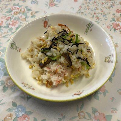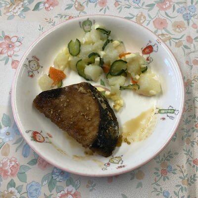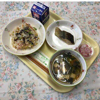 カツオのごまソースがけ 沢煮椀 ポテトサラダ 菜飯 牛乳