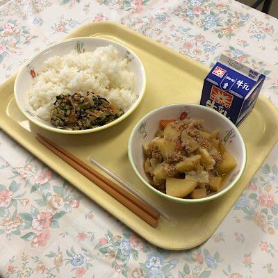 じゃがいもと生揚げのそぼろ煮 納豆和え ごはん 牛乳