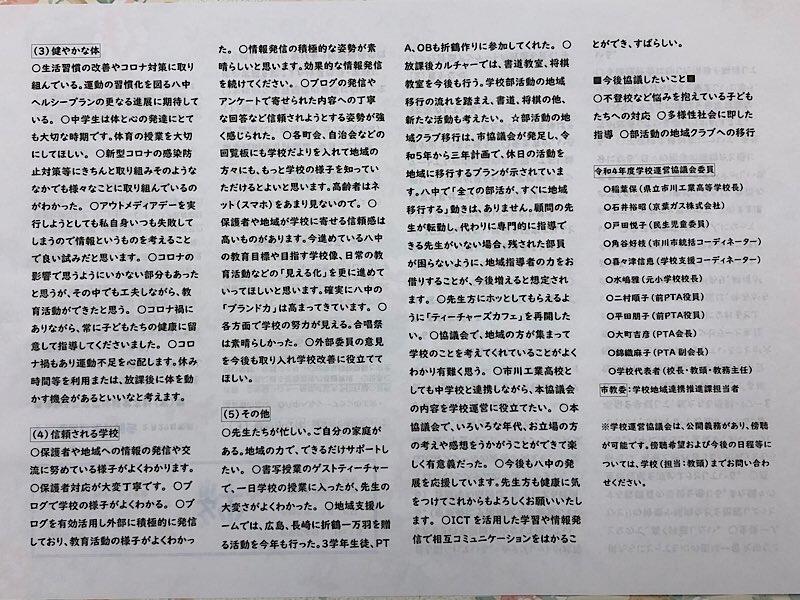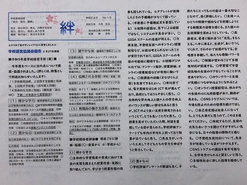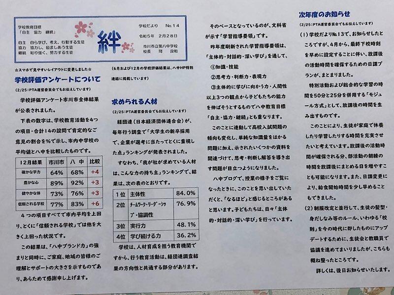 内容:後期学校運営アンケート、新型コロナ感染予防、欠席時のオンライン授業参加、最終下校時刻の変更(令和5年度)、八中ブログ2022いいね!ランキング(裏面・八中ブログに先月アップしたもの)
