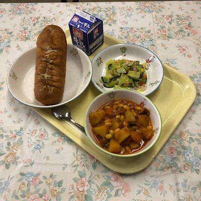 揚げパン ポークビーンズ ハムサラダ 牛乳