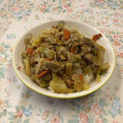 炒めた豚肉と野菜をみそ仕立ての味付けで、ごはんに乗せました