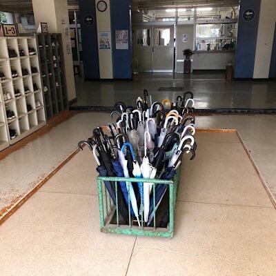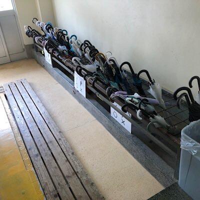 生徒昇降口のカサ立ては、今日も帰るときに取りやすく並んでいます