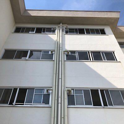 教室のエアコンにつながる室外機と周辺に水をまき、気加熱で冷やして冷却効率を高めています