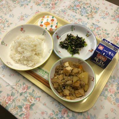 家常豆腐 コーンナムル 麦ご飯 牛乳