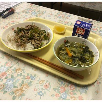焼肉丼 にら玉スープ 牛乳