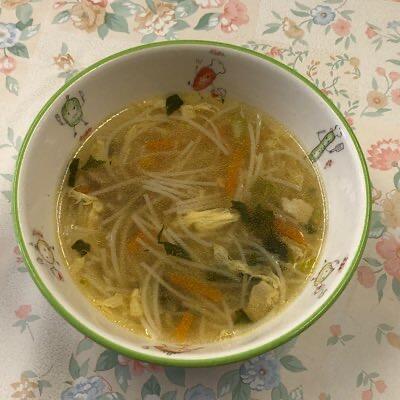喉ごしなめらかなビーフン、かき卵、野菜が三味一体、味わい深いスープ