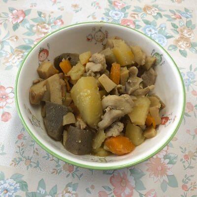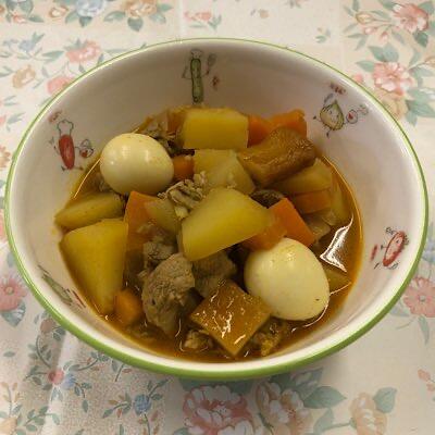 豚肉、さつま揚げ、うずら卵、ジャガイモ、ニンジン、玉ねぎ、セロリを煮込み、