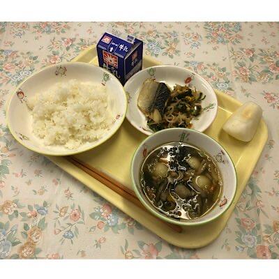 ごはん、鯖の文化干し、だまこ汁、おかか和え、市川の梨、牛乳