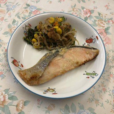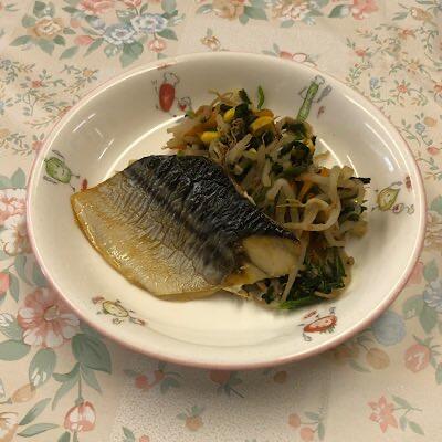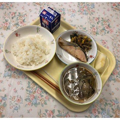 鮭の味噌マヨネーズ焼き 沢煮椀 おかか和え ごはん りんご 牛乳