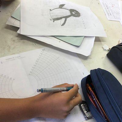 方眼紙に描いた絵を曲面用の縮尺に書き移します