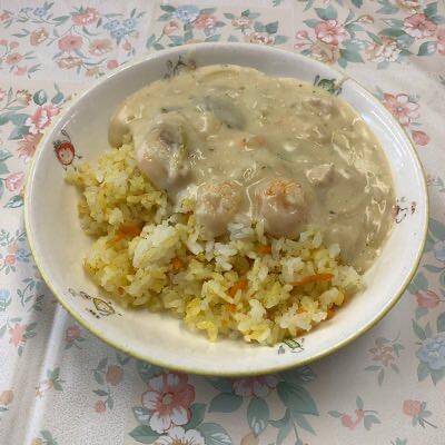 華やかな彩りのピラフに、バター風味のホワイトソースが加わり、味わい豊かな一品です