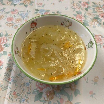 タマネギの甘さを引き出したスープ、ベーコンと相性バツグンです