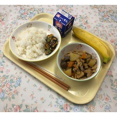 いり鶏煮 ごはん 納豆和え バナナ 牛乳